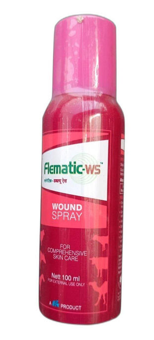 Flematic WS Wound Spray is a comprehensive skin care product for small and large animals, used to treat various skin conditions, including deep-seated wounds, maggoted wounds, dermatomycosis, mange, and infestations.