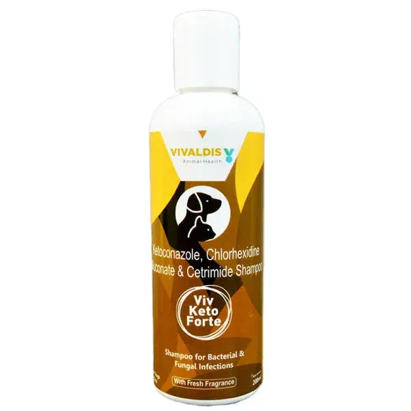 Viv Keto forte shampoo from Vivaldis is an antifungal- antibacterial - antiseptic shampoo, used to treat fungal and associated secondary bacterial skin infections. It contains Ketoconazole, Chlorhexidine and Cetrimide as active ingredients. Ketoconazole inhibits the synthesis of ergosterol, a major component of the fungal cell membrane and Chlorhexidine & Cetrimide has antimicrobial and antiseptic properties.